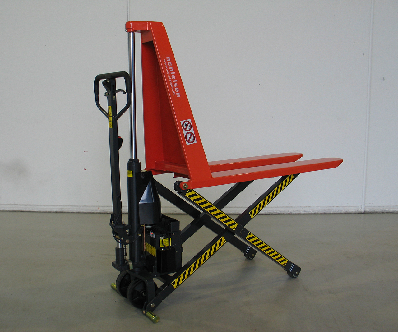 Elektrisk sakseløftevogn med en løftekapacitet på 1.000 kg. Inkl. batteriindikator, batteri og lader